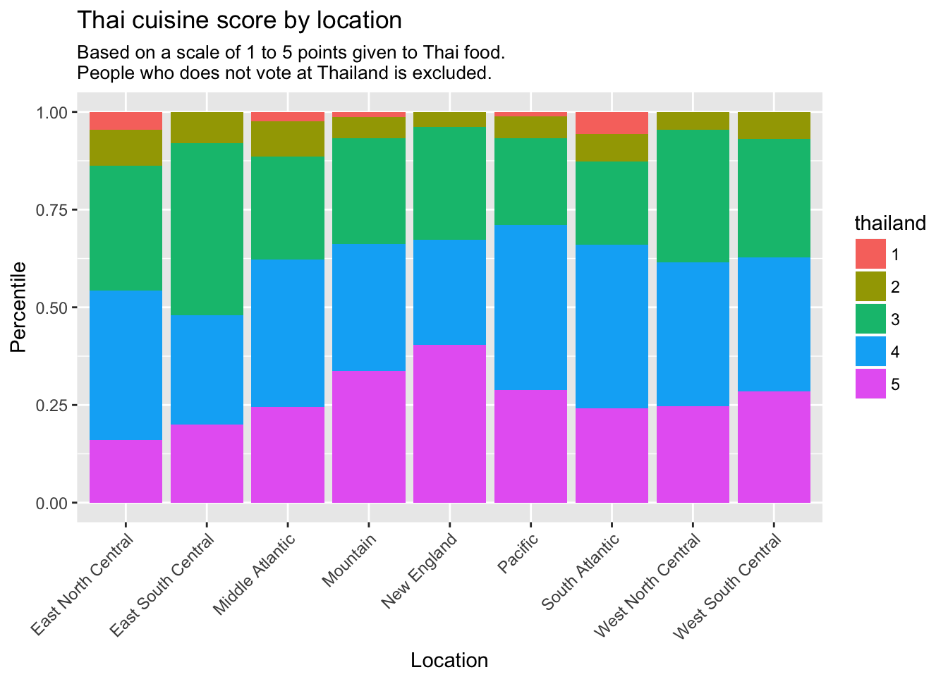 The bar graph visualizes that people in New England really enjoyed Thai food. People count in each location is varied. So we normalized it into a stacked bar graph for more impact result.