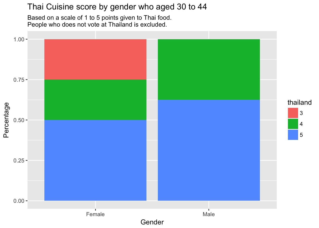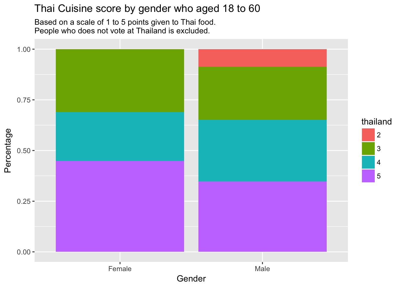 Conclusion This strongly supports the fact that Women does love Thai food over Male, with almost 50% of the sample gives a full score to Thai cuisine.